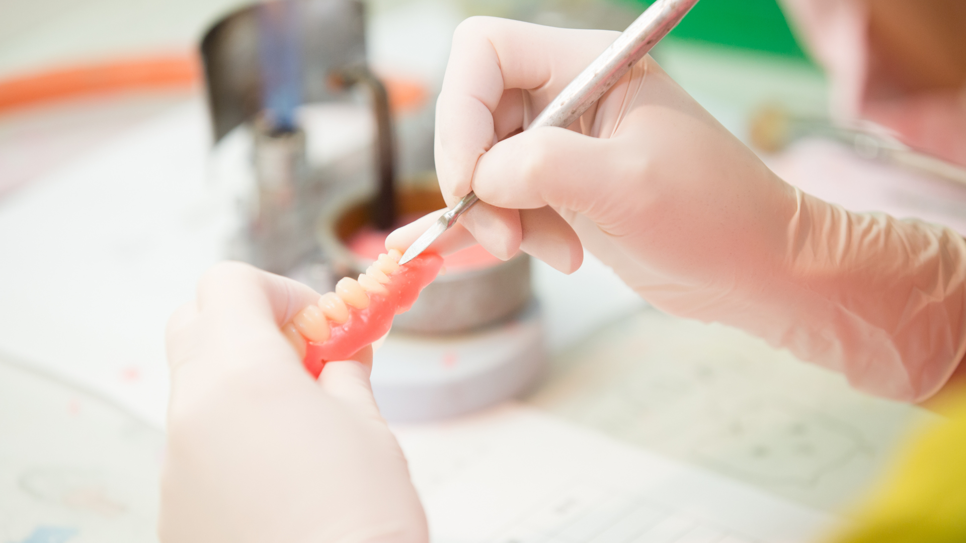 ワックスで義歯を石膏のなかに埋めて、熱でワックスを溶かして流し、そのあいた空間に流動性のある合成樹脂を流し込み、重合硬化させ、それを磨いて義歯を完成させます。