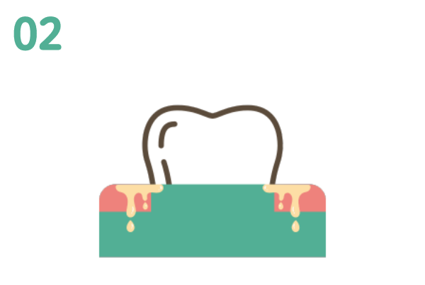 お口の中にはたくさんの細菌がいますが、歯磨きが不十分だと細菌が集まって「プラーク(歯垢)」となります。このプラークが歯ぐきに炎症を引き起こし、やがて歯を支える骨を溶かしてしまいます。